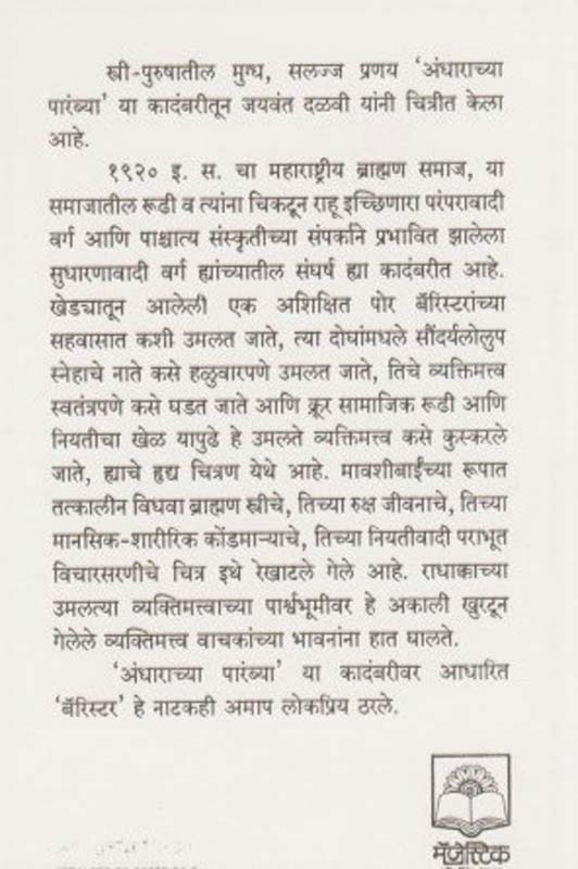 १९२० इ.स.चा महाराष्ट्रीय ब्राह्मण समाज, या समाजातील रूढी व त्यांना चिकटून राहू इच्छिणारा परंपरावादी वर्ग आणि पाश्चात्य संस्कृतीच्या संपर्काने प्रभावित झालेला सुधारणावादी वर्ग ह्यांच्यातील संघर्ष ह्या कादंबरीत आहे. खेड्यातून आलेली एक अशिक्षित पोर बॅरिस्टरांच्या सहवासात कशी उमलत जाते, त्या दोघांमधले सौंदर्य्लोलुप स्नेहाचे नाते कसे हळुवारपणे उमलत जाते,तिचे व्यक्तिमत्व स्वतंत्रपणे कसे घडत जाते आणि क्रूर सामाजिक रूढी आणि नियतीचा खेळ यापुढे हे उमलते व्यक्तिमत्व कसे कुस्करलेजाते, ह्याचे ह्रुद्य चित्रण येथे आहे.’अंधाराच्या पारंब्या’ या कादंबरीवर आधारित ’बॅरिस्टर’ हे नाटकही अमाप लोकप्रिय ठरले.