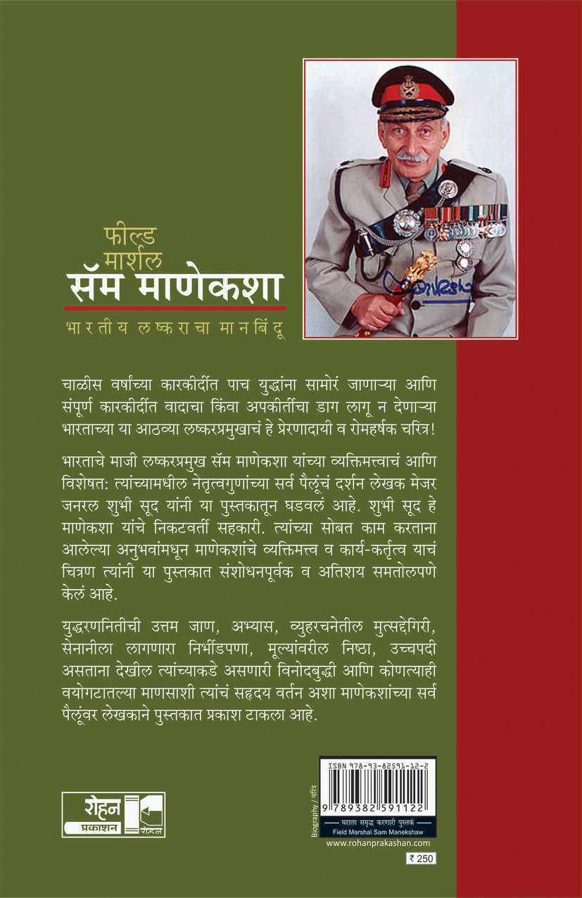 चाळीस वर्षांच्या कारकीर्दीत पाच युध्दांना सामोरं जाणाऱ्या आणि संपूर्ण कारकीर्दीत वादाचा किंवा अपकीर्तीचा डाग लागू न देणाऱ्या भारताच्या या आठव्या लष्करप्रमुखाचं हे प्रेरणादायी व रोमहर्षक चरित्र! भारताचे माजी लष्करप्रमुख सॅम माणेकशा यांच्या व्यक्तिमत्त्वाचं आणि विशेषत: त्यांच्यामधील नेतृत्वगुणांच्या सर्व पैलूंचं दर्शन लेखक मेजर जनरल शुभी सूद यांनी या पुस्तकातून घडवलं आहे. शुभी सूद हे माणेकशा यांचे निकटवर्ती सहकारी. त्यांच्या सोबत काम करताना आलेल्या अनुभवांमधून माणेकशांचे व्यक्तिमत्त्व व कार्य-कर्तृत्व याचं चित्रण त्यांनी या पुस्तकात संशोधनपूर्वक व अतिशय समतोलपणे केलं आहे. युध्दरणनितीची उत्तम जाण, अभ्यास, व्युहरचनेतील मुत्सद्देगिरी, सेनानीला लागणारा निर्भीडपणा, मूल्यांवरील निष्ठा, उच्चपदी असताना देखील त्यांच्याकडे असणारी विनोदबुध्दी आणि कोणत्याही वयोगटातल्या माणसाशी त्यांचं सहृदय वर्तन अशा माणेकशांच्या सर्व पैलूंवर लेखकाने पुस्तकात प्रकाश टाकला आहे.