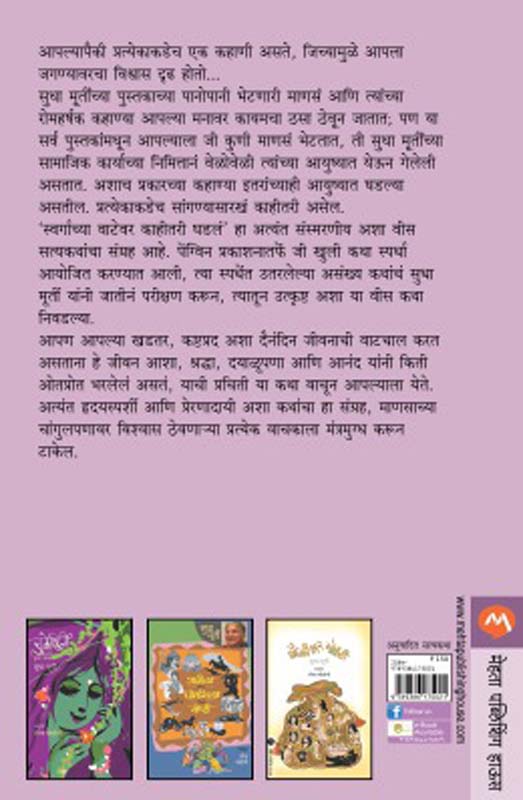 आपल्यापैकी प्रत्येकाकडेच एक कहाणी असते, जिच्यामुळे आपला जगण्यावरचा विश्वास दृढ होतो... सुधा मूर्तींच्या पुस्तकाच्या पानोपानी भेटणारी माणसं आणि त्यांच्या रोमहर्षक कहाण्या आपल्या मनावर कायमचा ठसा ठेवून जातात. पण या सर्व पुस्तकांमधून आपल्याला जी कुणी माणसं भेटतात, ती सुधा मूर्तींच्या सामाजिक कार्याच्या निमित्तानं वेळोवेळी त्यांच्या आयुष्यात येऊन गेलेली माणसं असतात. पण तशाच प्रकारच्या कहाण्या इतरांच्याही आयुष्यात घडल्या असतील. प्रत्येकाकडेच सांगण्यासारखं काहीतरी असेल. ‘स्वर्गाच्या वाटेवर काहीतरी घडलं’ हा अत्यंत संस्मरणीय अशा वीस सत्यकथांचा संग्रह आहे. पेंग्विन प्रकाशनातर्फे जी खुली कथा स्पर्धा आयोजित करण्यात आली, त्या स्पर्धेत उतरलेल्या असंख्य कथांचं सुधा मूर्ती यांनी जातीनं परीक्षण करून, त्यातून उत्कृष्ट अशा या वीस कथा निवडल्या. आपण आपल्या खडतर, कष्टप्रद अशा दैनंदिन जीवनाची वाटचाल करत असताना हे जीवन आशा, श्रद्धा, दयाळूपणा आणि आनंद यांनी किती ओतप्रोत भरलेलं असतं, याची प्रचीती या कथा वाचून आपल्याला येते. अत्यंत हृदयस्पर्शी आणि प्रेरणादायी अशा कथांचा हा संग्रह, माणसाच्या चांगुलपणावर विश्वास ठेवणाऱ्या प्रत्येक वाचकाला मंत्रमुग्ध करून टाकेल.