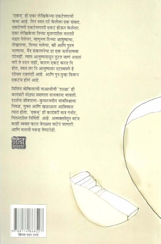 ’एकम’ ही एका लेखिकेच्या एकटेपणाची कथा आहे. तिनं स्वत:शी केलेला एक संवाद. एकटेपणाशी एकटं होऊन केलेला. एका लेखिकेचा तिच्या सॄजनशील मनाशी घडत गेलेला, म्हणूनच तिच्या आयुष्याचा, लेखनाचा, तिच्या भाषेचा, स्त्री आणि पुरुष नात्याचा, मैत्र संकल्पनेचा हा एक सर्जनात्मक शोधही. त्यात आयुष्यापासून तुटत जाणं असलं तरी ते रुदन नाही, कारण एकटं करत नि होत, स्वत:ला नि आयुष्याला तटस्थपणे हे शोधत राहणंही आहे. आणि पुन:पुन्हा फिरून एकटंच होणं आहे. मिलिंद बोकिलांची याआधीची ’शाळा’ ही कादंबरी मोठया प्रमाणावर वाचकांना भावली. शालेय जीवनाचा-कुमारवयीन भावविश्वाचा नितळ, मुक्त आणि खळाळता आविष्कार त्यात होता. ’एकम’ ही कादंबरी मात्र गंभीर, चिंतनशील निर्मिती आहे. अव्यक्ततेतून बरंच काही व्यक्त करत वेगळया वाटेनं जाणारी. आणि मनाची पकड घेणारीही.