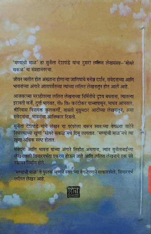 ’मण्यांची माळ’ हा सुनिता देशपांडे यांचा दुसरा लेखसंग्रह- ’सोयरे सकळ’ या संग्रहानंतरचा जीवन व्यतीत होत असताना होणा-या जाणिवांचे मनोज्ञ दर्शन, संवेदनाच्या आणि भावनांचया अंगाने आतापर्यतच्या त्यांच्या ललित लेखनातून होत आले आहे. आजवरच्या मराठीतल्या ललित लेखनाच्या निर्मितीचे दृश्य बघताना, त्यातल्या इरावती कर्वे, दुर्गा भागवत, गो. वि. करंदीकर यांच्यापासून, माधव आचवल, श्रीनिवास विनायक, वासंती मुझुमदार आदींच्या लेखनातून, असा संवेदनांचा, भावनांचा आविष्कार दिसतो. सुनीता देशपांडे यांचे लेखन या परंपरेला धरून स्वत:च्या वेगळ्या वाटेने निघाल्याच्या खुणा ’सोयरे सकळ’मधे दिसू लागतात. ’मण्यांची माळ’मध्ये त्या खुणा अधिक स्पष्ट होतात. संवेदना आणि भावना यांच्या अंगाने लिहीत असताना, त्यांत सुनीताबाईंच्या लेखनातली विचारगर्भता एकरस होऊन जाते आणि ललित लेखनाचे एक नवे रसायन निर्माण होते. ’मण्यांची माळ’ हे पुस्तक म्हणजे स्वत:च्या वेगळेपणाने साकारलेले, विचारगर्भ ललित लेखन आहे.