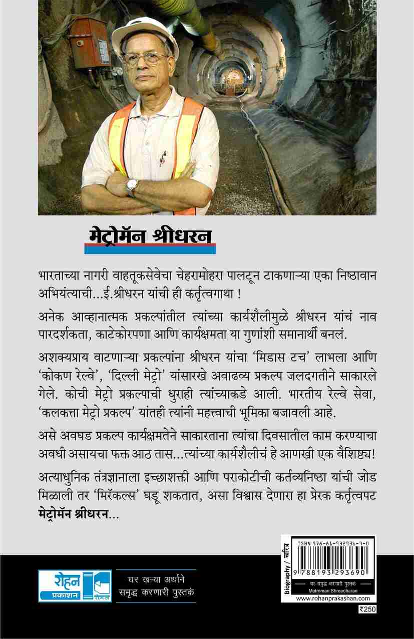 भारताच्या नागरी वाहतूकसेवेचा चेहरामोहरा पालटून टाकणार्या एका निष्ठावान अभियंत्याची...ई.श्रीधरन यांची ही कर्तृत्वगाथा ! अनेक आव्हानात्मक प्रकल्पांतील त्यांच्या कार्यशैलीमुळे श्रीधरन यांचं नाव पारदर्शकता, काटेकोरपणा आणि कार्यक्षमता या गुणांशी समानार्थी बनलं. अशक्यप्राय वाटणाNया प्रकल्पांना श्रीधरन यांचा `मिडास टच' लाभला आणि `कोकण रेल्वे', `दिल्ली मेट्रो' यांसारखे अवाढव्य प्रकल्प जलदगतीने साकारले गेले. कोची मेट्रो प्रकल्पाची धुराही त्यांच्याकडे आली. भारतीय रेल्वे सेवा, `कलकत्ता मेट्रो प्रकल्प' यांतही त्यांनी महत्त्वाची भूमिका बजावली आहे. असे अवघड प्रकल्प कार्यक्षमतेने साकारताना त्यांचा दिवसातील काम करण्याचा अवधी असायचा फक्त आठ तास...त्यांच्या कार्यशैलीचं हे आणखी एक वैशिष्ट्य! अत्याधुनिक तंत्रज्ञानाला इच्छाशक्ती आणि पराकोटीची कर्तव्यनिष्ठा यांची जोड मिळाली तर `मिरॅकल्स' घडू शकतात, असा विश्वास देणारा हा प्रेरक कर्तृत्वपट मेट्रोमॅन श्रीधरन...