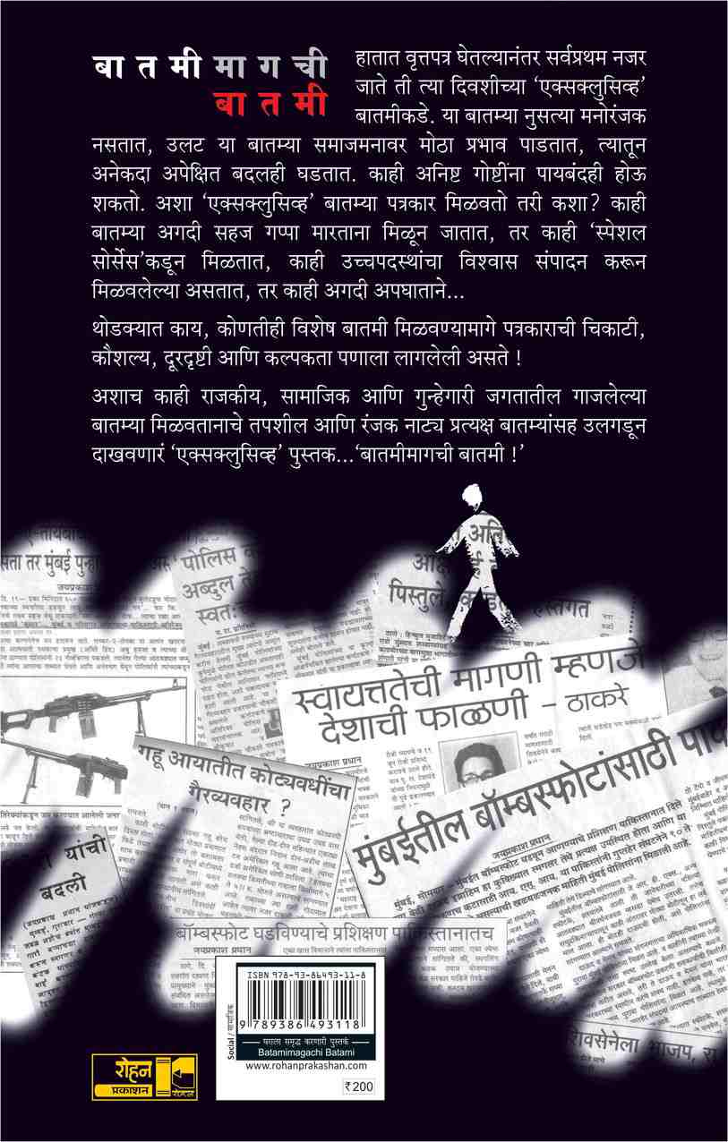 हातात वृत्तपत्र घेतल्यानंतर सर्वप्रथम नजर जाते ती त्या दिवशीच्या ‘एक्सक्लुसिव्ह' बातमीकडे. या बातम्या नुसत्या मनोरंजक नसतात, उलट या बातम्या समाजमनावर मोठा प्रभाव पाडतात, त्यातून अनेकदा अपेक्षित बदलही घडतात. काही अनिष्ट गोष्टींना पायबंदही होऊ शकतो. अशा ‘एक्सक्लुसिव्ह' बातम्या पत्रकार मिळवतो तरी कशा? काही बातम्या अगदी सहज गप्पा मारताना मिळून जातात, तर काही ‘स्पेशल सोर्सेस'कडून मिळतात, काही उच्चपदस्थांचा विश्वास संपादन करून मिळवलेल्या असतात, तर काही अगदी अपघाताने... थोडक्यात काय, कोणतीही विशेष बातमी मिळवण्यामागे पत्रकाराची चिकाटी, कौशल्य, दूरदृष्टी आणि कल्पकता पणाला लागलेली असते ! अशाच काही राजकीय, समाजिक आणि गुन्हेगारी जगतातील गाजलेल्या बातम्या मिळवतानाचे तपशील आणि रंजक नाट्य प्रत्यक्ष बातम्यांसह उलगडून दाखवणारं ‘एक्सक्लुसिव्ह' पुस्तक...‘बातमीमागची बातमी !'
