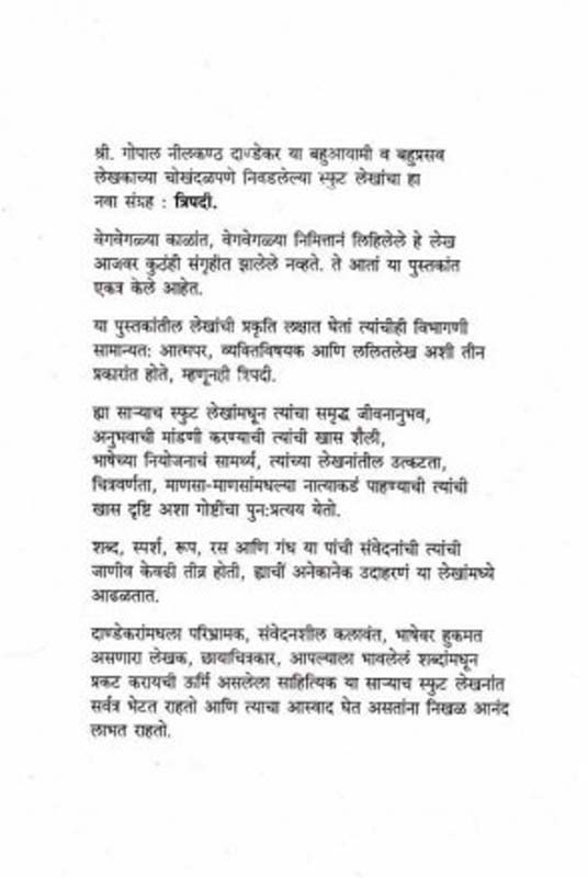 श्री. गोपाल नीलकण्ठ दाण्डेकर या बहुआयामी व बहुप्रसव लेखकाच्या चोखंदळपणे निवडलेल्या स्फुट लेखांचा हा नवा संग्रह : त्रिपदी. वेगवेगळ्या काळांत, वेगवेगळ्या निमित्तानं लिहिलेले हे लेख आजवर कुठंही संगृहीत झालेले नव्हते. ते आतां या पुस्तकांत एकत्र केले आहेत. या पुस्तकांतील लेखांची प्रकृति लक्षात घेतां त्यांचीही विभागणी सामान्यत: आत्मपर, व्यक्तिविषयक आणि ललितलेख अशी तीन प्रकारांत होते, म्हणूनही त्रिपदी. ह्या सार्याच स्फुट लेखांमधून त्यांचा समृध्द जीवनानुभव, अनुभवाची मांडणी करण्याची त्यांची खास शैली, भाषेच्या नियोजनाचं सामर्थ्य, त्यांच्या लेखनांतील उत्कटता, चित्रवर्णता, माणसा-माणसांमधल्या नात्याकडं पाहण्याची त्यांची खास दृष्टी अशा गोष्टींचा पुन:प्रत्यय येतो. शब्द, स्पर्श, रूप, रस आणि गंध या पांची संवेदनांची त्यांची जाणीव केवढी तीव्र होती, ह्यांचीं अनेकानेक उदाहरणं या लेखांमध्ये आढळतात. दाण्डेकरांमधला परिभ्रामक, संवेदनशील कलावंत, भाषेवर हुकुमत असणारा लेखक, छायाचित्रकार, आपल्याला भावलेलं शब्दांमधून प्रकट करायची ऊर्मि असलेला साहित्यिक या सार्याच स्फुट लेखनांत सर्वत्र भेटत राहतो आणि त्याचा आस्वाद घेत असतांना निखळ आनंद लाभत राहतो.