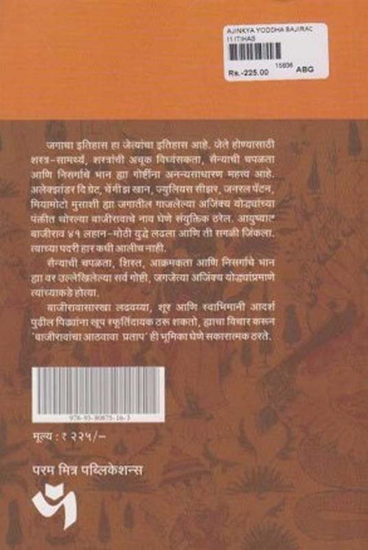 जगाचा इतिहास हा जेत्यांचा इतिहास आहे. जेते होण्यासाठी शस्त्र - सामर्थ्य, शस्त्रांची अचूक विध्वंसकता, सैन्याची चपळता आणि निसर्गाचे भान हया गोष्टींना अनन्यसाधारण महत्व आहे. अलेक्झांडर दि ग्रेट, चेंगीझ खान, ज्युलियस सीझर, जनरल पॅटन, मियामोटो मुसाशी या जगातील गाजलेल्या अजिंक्य योध्दांच्या पंक्तीत थोरल्या बाजीरावाचे नाव घेणे संयुक्तिक ठरेल. आयुष्यात बाजीराव 41 लहान - मोठी युध्दे लढला आणि ती सगळी जिंकला.