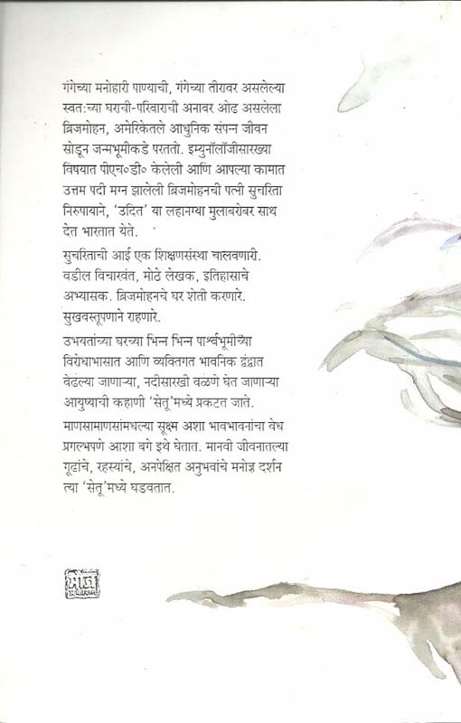 गंगेच्या मनोहारी पाण्याची, गंगेच्या तीरावर असलेल्या स्वत:च्या घराची परिवाराची अनावर ओढ असलेला ब्रिजमोहन, अमेरिकेतले आधुनिक संपन्न जीवन सोडून जन्मभूमीकडे परततो. इम्युनॉलॉजीसारख्या विषयात पी.डी. केलेली आणि आपल्या कामात उत्तम पदी मग्न झालेली ब्रिजमोहनाची पत्नी सुचारिता निरूपायाने, ’उदित’ या लहानग्या मुलाबरोबर साथ देत भारतात येते. सुचरिताची आई एक शिक्षणसंस्था चालवणारी. वडील विचारवंत, मोठे लेखक, इतिहासाचे अभ्यासक. ब्रिजमोहनाचे घर शेती करणारे. सुखवस्तूपणाने राहणारे. उभयतांच्या घरच्या भिन्न-भिन्न पाश्र्वभूमीच्या विरोधाभासात आणि व्यक्तिगत भावनिक व्दंव्दात वेढल्या जाणा-या, नदीसारखी वळणे घेत जाणा-या आयुष्याची कहाणी ’सेतू’मध्ये प्रकटत जाते. माणसामाणसांमधल्या सूक्ष्म अशा भावभावनांचा वेध प्रगल्भपणे आशा बगे इथे घेतात. मान्वी जीवनातल्या गूढांचे, रहस्यांचे, अनपेक्षित अनुभवांचे मनोज्ञ दर्शन त्या ’सेतू’मध्ये घडवतात.