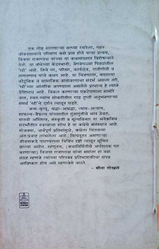एक गोष्ट सांगणाऱ्या साध्या रचनेला, गहन जीवनाशयाचे परिणाम कसे प्राप्त होते याचा प्रत्यय, विजया राजाधक्ष्य यांच्या या कथासंग्रहात विशेषत्वाने येतो. या कथेच्या केंद्रस्थानी, वेगवेगळ्या पिढ्यांतील "स्त्री" आहे. तिचे घर परिसर , कार्यक्षेत्र, नातीगोती व ताणताणाव यांचे कथन आहे. या चित्रणाला, बदलत्या कौटुंबिक व सामाजिक वातावरणाचा संदर्भ असला तरी, 'स्त्री' च्या आंतरिक जगण्याला असलेले प्राधान्य हे त्यांचे वैशिष्ट आहे. विकल करणाऱ्या एकटेपणाला सामोरे जात स्वतःच्याच सोबतीतील गाढ तृप्ती अनुभवणाऱ्या समर्थ 'स्त्री' चे दर्शन त्यातून घडते. जन्म - मृत्यू, श्रद्धा - अश्रद्धा, न्याय-अन्याय, साफल्य-वैफल्य यांच्यातील गुंतागुंतीचे भान ठेवत; मानवी अस्थित्व, संस्कृती व मूल्यविचार या अनेकविध संदर्भातील स्वत्वाचा शोध हे या कथेचे बलस्थान आहे. मोजक्या, अर्थपूर्ण प्रतिमांमुळे, कथेला चिंतनाचा अंतःप्रवाह लाभलेला आहे. नित्यनुतन असणाऱ्या जीवनाकडे पाहण्याच्या विविध दृष्टी त्यातून सूचित झाल्या आहेत. म्हणूनच, (कथानिर्मितीचे अर्धशतक पार करणाऱ्या) विजया राजाधक्ष्य यांचा समांतर हा नवा संग्रह म्हणजे त्यांच्या परिपक्व प्रतिभाशक्तीचा संपन्न अविष्कार होय असे म्हणावेसे वाटते. - मीना गोखले