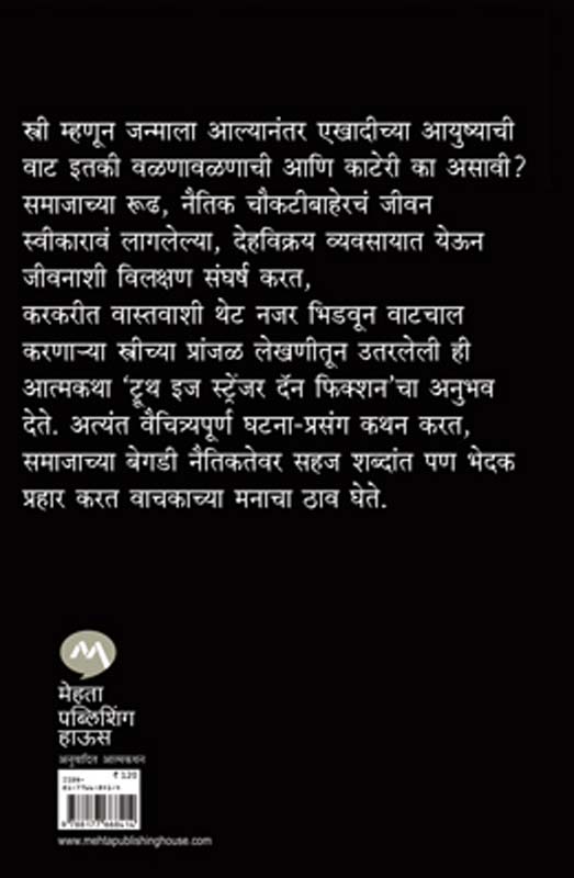 स्त्री म्हणून जन्माला आल्यानंतर एखादीच्या आयुष्याची वाट इतकी वळणावळणाची आणि काटेरी का असावी? समाजाच्या रूढ, नैतिक चौकटीबाहेरचं जीवन स्वीकारावं लागलेल्या, देहविक्रय व्यवसायात येऊन जीवनाशी विलक्षण संघर्ष करत, करकरीत वास्तवाशी थेट नजर भिडवून वाटचाल करणा-या स्त्रीच्या प्रांजळ लेखणीतून उतरलेली ही आत्मकथा `ट्रूथ इज स्ट्रेंजर दॅन फिक्शन’चा अनुभव देते. अत्यंत वैचित्र्यपूर्ण घटना-प्रसंग कथन करत, समाजाच्या बेगडी नैतिकतेवर सहज शब्दांत पण भेदक प्रहार करत वाचकाच्या मनाचा ठाव घेते.