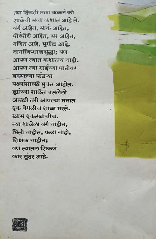 त्या दिवशी मला कळलं की शाळेची मजा कशात आहे ते. वर्ग आहेत, बाकं आहेत, पोरंपोरी आहेत, सर आहेत, गणित आहे, भूगोल आहे, नागरिकशास्त्रसुद्धा; पण आपण त्यात कशातच नाही. आपण त्या गाईंच्या पाठीवर बसणा-या पांढ-या पक्ष्यांसारखे मुक्त आहोत. ह्यांच्या शाळेत बसलेलो असलो तरी आपल्या मनात एक वेगळीच शाळा भरते. खास एकटयाचीच. त्या शाळेला वर्ग नाहीत, भिंती नाहीत, फळा नाही, शिक्षक नाहीत; पण त्यातलं शिकणं फार सुंदर आहे.