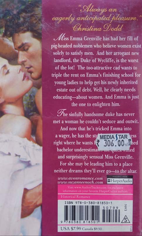 Miss Emma Grenville has had her fill of pig-headed noblemen who believe women exist solely to satisfy men. And her arrogant new landlord, the Duke of Wycliffe, is the worst of the lot! The too-attractive cad wants to triple the rent on Emma's finishing school for young ladies to help get his newly inherited estate out of debt. Well, he clearly needs educating—about women. And Emma is just the one to enlighten him. The sinfully handsome duke has never met a woman he couldn't seduce and outwit.And now that he's tricked Emma intoa wager, he has the stubborn headmistressright where he wants her. But the confirmedbachelor underestimates the quick-wittedand surprisingly sensual Miss Grenville. For she may be leading him to a placeneither dreams they'll ever go—to the altar.