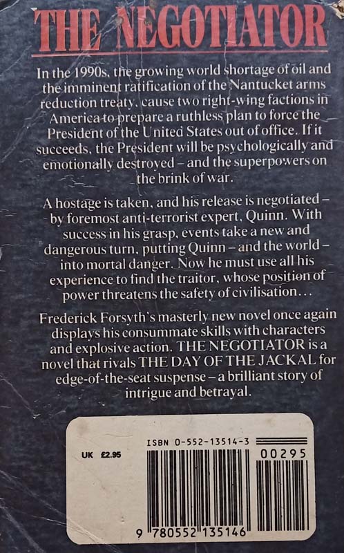 The Negotiator is a crime thriller novel by Frederick Forsyth. First published in 1989, the book was an international bestseller. Set in 1989, when an American oil tycoon, Cyrus Miller and a shipping tycoon, Melvin Scanlon, plan to conspire and surreptitiously bring the oil wealth of the Middle East under American and their, control. But with the American president’s stand threatening their scheme, Miller and Scanlon decide to eliminate the president and hire three mercenaries to do the job. As the first part of the plan, the president’s son, Simon, gets kidnapped. Anticipating a hostage situation, the CIA bring back Green Beret, aka Quinn, a retired CIA negotiator, for the job. Reluctant at first, Quinn agrees to do it but only if he is allowed to go about the situation his way. As Quinn studies the situation, assisted against his consent by Sam Somerville, a female FBI agent and Duncan McCrea, a CIA official, the kidnappers finally make contact with a demand for 2 million dollars’ worth of diamonds. All of Quinn’s effort seems to go to waste when fake news about the authorities getting close to kidnappers is released. With the situation getting out of hand, Quinn decides take matters into his own hands, stealing the diamonds and depositing them at the drop point. The kidnappers, on receiving the ransom, let Simon go but as he approaches Quinn, an explosion kills him as Quinn stands by, helpless. The devastated president now faces removal from his post. Quinn decides to deal with the situation himself and uncover the truth behind the strange actions. He must now somehow find out the truth behind this elaborately devious plan in time to save the president and thwart the schemes of the brains behind the scene. This edition of The Negotiator was published in paperback in 1990 by RHUK.