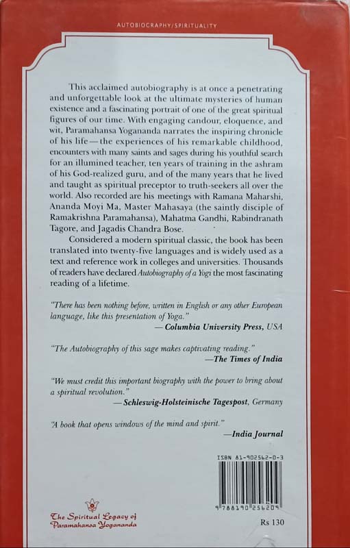 This acclaimed autobiography is at once a penetrating and unforgettable look at the ultimate mysteries of human existence and a fascinating portrait of one of the great spiritual figures of our time. With engaging candour, eloquence, and wit, Paramahansa Yogananda narrates the inspiring chronicle of his life-the experiences of his remarkable childhood, encounters with many saints and sages during his youthful search for an illumined teacher, ten years of training in the ashram of his God-realized guru, and of the many years that he lived and taught as spiritual preceptor to trut eekers all over the world. Also recorded are his meetings with Ramana Maharshi, Ananda Moyi Ma, Master Mahasaya (the saintly disciple of Ramakrishna Paramahansa), Mahatma Gandhi, Rabindranath Tagore, and Jagadis Chandra Bose.