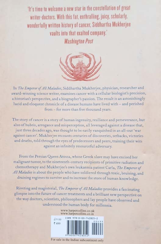 In The Emperor of All Maladies, Siddhartha Mukherjee, doctor, researcher and award-winning science writer, examines cancer with a cellular biologist's precision, a historian's perspective, and a biographer's passion. The result is an astonishingly lucid and eloquent chronicle of a disease humans have lived with - and perished from - for more than five thousand years. The story of cancer is a story of human ingenuity, resilience and perseverance, but also of hubris, arrogance and misperception, all leveraged against a disease that, just three decades ago, was thought to be easily vanquished in an all-out 'war against cancer' . Emperor of All Maladies is about the people who have soldiered through toxic, bruising, and draining regimes to survive and to increase the store of human knowledge. Riveting and magisterial, The Emperor of All Maladies provides a fascinating glimpse into the future of cancer treatments and a brilliant new perspective on the way doctors, scientists, philosophers and lay people have observed and understood the human body for millennia.