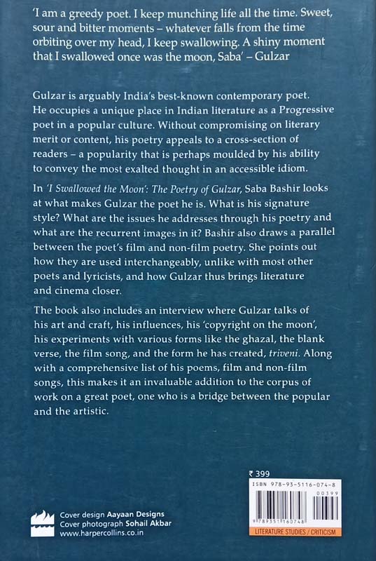 Gulzar is arguably the most well known contemporary poet writing in Hindustani. As a poet he occupies a unique place being a Progressive poet in a popular culture. His poetry appeals to all strata of society, without compromising either on literary merit or on its ability to convey the most exalted thought in an accessible idiom. In He Swallowed the Moon, Saba Bashir attempts to analyse what makes Gulzar the poet he is. What is his signature style? What are the issues that concern his poetry and what are the recurrent images in it? She also draws a parallel between the poets film and non-film poetry and points out how they are used interchangeably. Including the most comprehensive list of all Gulzars poems, film and non-film songs, this is a valuable addition to the corpus of work on a great poet.