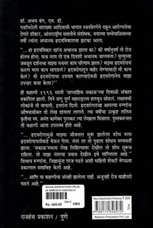 डॉ. अभय बंग, एम.डी. गडचिरोली सारख्या आदिवासी भागात स्वयंप्रेरणेने राहून आरोग्यसेवा देणारे डॉक्टर, आंतरराष्ट्रीय ख्यातीचे संशोधक, वयाच्या चव्वेचाळिसाव्या वर्षी त्यांना अचानक ह्रदयविकाराचा झटका आला. ”… हा हृदयविकार खरंच अचानक झाला का? की वर्षानुवर्षं तो रोज होतच होता; फक्त मला तो एक दिवशी अचानक जाणवला? मृत्यूच्या जवळून दर्शनाचा माझ्या मनावर काय परिणाम झाला? माझ्या हृदयरोगाचं कारण मला काय सापडलं? हृदयरोगातून बाहेर येण्यासाठी मी काय केलं? मी हृदयरोगाचा उपचार करण्याऐवजी हृदयरोगानेच माझा उपचार कसा केला?” ही कहाणी 1996 साली ‘साप्ताहिक सकाळ’च्या दिवाळी अंकात प्रकाशित झाली. तिने जणू पूर्ण महाराष्ट्राला हलवून सोडलं. लक्षावधी लोकांनी ती वाचली, इतरांना दिली. हृदयरोगतज्ज्ञ आपल्या रुग्णांना औषधासोबत तो लेख द्यायला लागले. त्या वर्षीचा उत्कृष्ट ललित कृतीचा स्व. अनंत काणेकर पुरस्कार त्या लेखाला मिळाला. पुस्तकरूपात ती कहाणी आता उपलब्ध होते आहे. ”… हृदयरोगामुळे माझ्या जीवनात सुरू झालेला शोध मला हृदयरोगापलीकडे घेऊन गेला. नंतर तर तो पुढला शोधच मध्यवर्ती झाला. ‘सकाळ’मधला लेख लिहिल्यावर देखील तो शोध सुरूच राहिला. तो माझा नंतरचा प्रवास देखील इथे सांगितला आहे.” शिवाय रुग्णांना, जिज्ञासूंना गरज पडते अशी माहिती शेवटी वेगळया प्रकरणात समाविष्ट केली आहे. ”… आणि या कहाणीचा अंतही झालेला नाही. अजूनही रोज काहीतरी घडतं आहे.”