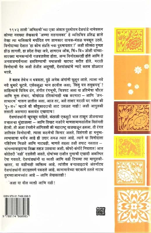 देशपांड्यांनी खूपखूप पाहिले. कंठाळी एकसुरी चाल टाकून जीवनाच्या तर्हातर्हा धुंडाळल्या - आणि तिखट नजरेने माणसामाणसांतील विसंगती हेरली. ती अशा रंगतीने सांगितली की महाराष्ट्र खळखळून हसला. ती रंगत जातिवंत विनोदाची. त्याला करुणेची किनार असते. विसंगती हा मनुष्य स्वभावाचा धर्मच आहे ही उदार समज त्यात आहे. त्याने या विनोदाला गहिरेपण मिळते आणि नाट्यही. माणसे सहसा तशी सपाट नसतात - चांगल्यावाइटाचा शिक्का सहज उठवावा अशी. कोपरे-कंगोरे निघतात ! आत कोठेतरी ‘वल्ली’ दडलेली असते. दोषांच्या राशीत गुणाची एखादी अकल्पित रेषा गवसते. देशपांड्यांनी या व्यक्ती आणि वल्ली टिपल्या त्या माणुसकीखातर. या वल्लींनाही व्यक्तित्त्व आहे. त्यांतील बर्यावाइटाचे अंतर्नाट्य देशपांड्यांनी सराइतपणे पकडले आहे. कानामात्रेच्या फरकाने तसले नाट्य तुमच्याआमच्यांत आहे - आणि लेखकातही! अशा या वीस व्यक्ती आणि वल्ली.