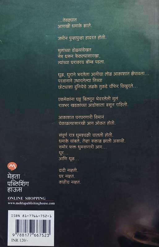 ...तेवढ्यात आणखी धमाके झाले. जमीन पुन्हापुन्हा हादरत होती. मुलांच्या डोळ्यांदेखत नेम धरून फेकल्यासारखा, त्यांच्या घरावरच बॉम्ब पडला. धूळ, धुराने भरलेला आगीचा लोळ आकाशात झेपावला... परवानाने उभारलेल्या तिच्या छोट्याशा दुनियेचे जळके तुकडे चौफेर विखुरले... एकमेकांना घट्ट बिलगून भेदरलेली मुलं रात्रभर खडकांच्या आडोशाला बसून राहिली. आकाशात घरघरणारी विमानं चेकाळल्यासारखी आग ओकत होती. संपूर्ण रात्र धुमश्चक्री चालली होती. धमाके थांबले, तेव्हा सकाळ झाली असावी. समोर फक्त धुमसणारी आग... धूर... आणि धूळ... दादी नव्हती. घर नव्हतं. काहीच नव्हतं.