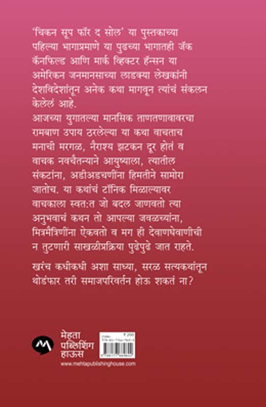 ‘चिकन सूप फॉर द सोल’ या पुस्तकाच्या पहिल्या भागाप्रमाणे या पुढच्या भागातही जॅक कॅनफिल्ड आणि मार्क हॅन्सन या अमेरिकन जनमानसाच्या लाडक्या लेखकांनी देशविदेशांतून अनेक कथा मागवून त्यांचं संकलन केलेलं आहे. आजच्या युगातल्या मानसिक ताणतणावावरचा रामबाण उपाय ठरलेल्या या कथा वाचताच मनाची मरगळ, नैराश्य झटकन दूर होतं व वाचक नवचैतन्याने आयुष्याला, त्यातील संकटांना, अडीअडचणींना हिमतीने सामोरा जातोच. या कथांचं टॉनिक मिळाल्यावर वाचकाला स्वत:त जो बदल जाणवतो त्या अनुभवाचं कथन तो आपल्या जवळच्यांना, मित्रमैत्रिणींना ऐकवतो व मग ही देवाणघेवाणीची न तुटणारी साखळीप्रक्रिया पुढेपुढे जात राहते. खरंच कधीकधी अशा साध्या, सरळ सत्यकथांतून थोडंफार तरी समाजपरिवर्तन होऊ शकतं ना?