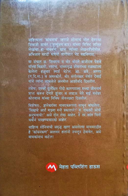 साहित्याला `कांचनाचं` म्हणजे सोन्याचं मोल देणाऱ्या शिवाजी सावंत (`मृत्युंजय`कार) यांच्या विविध ललित लेखांचा हा भावसंच. खास त्यांच्या लेखनशैलीतील. अभिजात मराठी भाषेची जागोजाग भेट घडविणारा. या संचात छ. शिवराय व वीर थोरले बाजीराव पेशवे यांच्या विक्रमी, तशाच, भावसमृद्ध जीवनाच्या तळवटाला केलेला हळुवार स्पर्श भेटेल. आ. अत्रे, अण्णा (ग.दि.मा.) व अमरकीर्त, थोर संगीतकार वसंत देसाई यांचे त्यांना लाभलेले अनमोल आशीर्वाद दिसतील. तसेच, एरव्ही दुर्लक्षित गोदी कामगाराला सच्चा जीवनार्थ प्राप्त करून देणारे झुंजार व लढाऊ नेते भाई मनोहर कोतवाल यांच्या विविध जीवनछटा दिसतील. विशेषत: ज्ञानेश्वरांवर भावएकरूपता साधून बांधलेला, `विश्वाचे आर्त माझ्या मनी प्रकाशले!` व `एकतरी ओवी अनुभवावी!` असे दोन लेख आहेत. ते तर शांत चित्ती चवीनं चाखण्यासारखे आहेत. साहित्य सोनियाची समृद्ध खाण असलेल्या मायमराठीत हे `कांचनकण` अलवार हातांनी उचलून ठेवावेत, असे वाचकांनाच वाटेल.