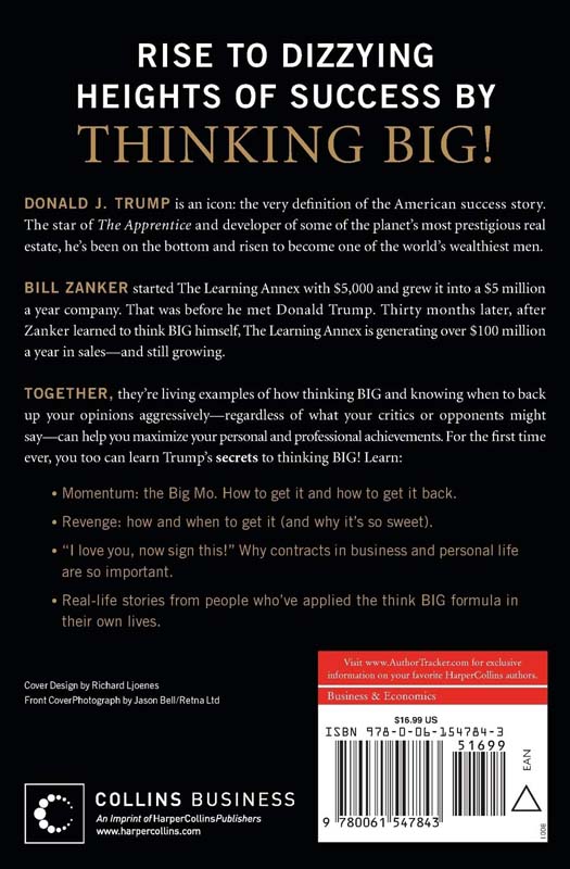 DONALD J. TRUMP is an icon: the very definition of the American success story. The star of The Apprentice and developer of some of the planet’s most prestigious real estate, he’s been on the bottom and risen to become one of the world’s wealthiest men. BILL ZANKER started The Learning Annex with $5,000 and grew it into a $5 million a year company. That was before he met Donald Trump. Thirty months later, after Zanker learned to think BIG himself, The Learning Annex is generating over $100 million a year in sales—and still growing. TOGETHER, they’re living examples of how thinking BIG and knowing when to back up your opinions aggressively—regardless of what your critics or opponents might say—can help you maximize your personal and professional achievements. For the first time ever, you too can learn Trump’s secrets to thinking BIG! Learn: Momentum: the Big Mo. How to get it and how to get it back. Revenge: how and when to get it (and why it’s so sweet). “I love you, now sign this!” Why contracts in business and personal life are so important. Real-life stories from people who’ve applied the think BIG formula in their own lives.