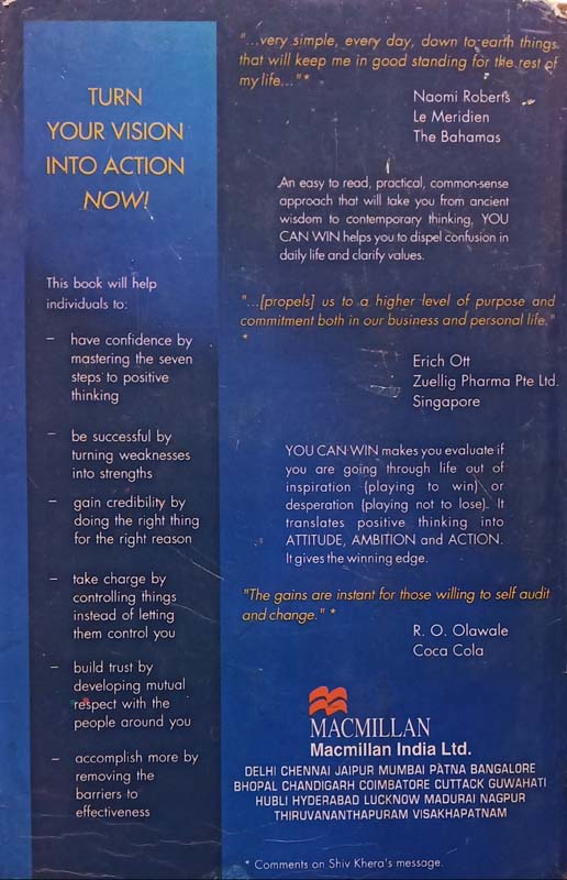 An easy-to-read, practical, common-sense guide that will take you from ancient wisdom to modern-day thinking, You Can Win helps you establish new goals, develop a new sense of purpose, and generate new ideas about yourself and your future. It guarantees, as the title suggests, a lifetime of success. The book enables you to translate positive thinking into attitude, ambition and action to give you the winning edge. This book will help you to: Build confidence by mastering the seven steps to positive thinking. Build confidence by mastering the seven steps to positive thinking. Gain credibility by doing the right things for the right reasons. Take charge by controlling things instead of letting them control you. Build trust by developing mutual respect with people around you. Accomplish more by removing the barriers to effectiveness.