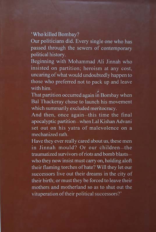 Have they ever really cared about us, these men in Jinnah mould? Or our children-the traumatized survivors of riots and bomb blasts who they now insist must carry on, holding aloft their flaming torches of hate? Will they let our successors live out their dreams in the city of their birth; or must they be forced to leave their mothers and motherland so as to shut out the vituperation of their political successors?"